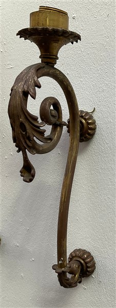 Coppia di applique a una fiamma in metallo dorato decorato a volute fogliate, b