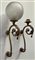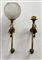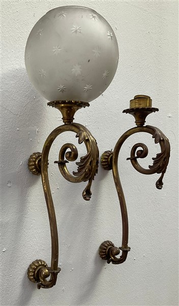 Coppia di applique a una fiamma in metallo dorato decorato a volute fogliate, bocce in vetro (difetti e rotture, manca una boccia)