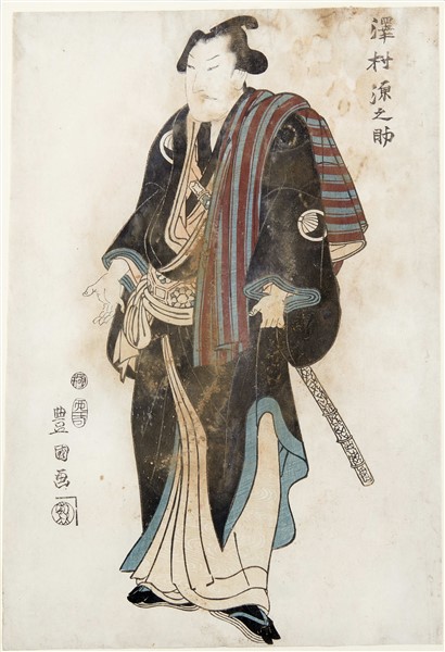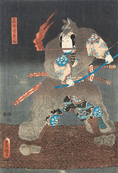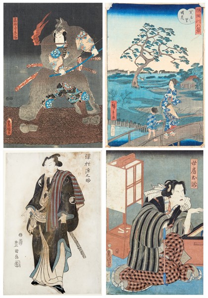 Lotto composto da un oban da polittico di Kunisada, un oban da una serie di Hiroshige II, un oban di Toyokuni I attore in parte di lottatore di sumo e da un foglio da trittico di Kunisada