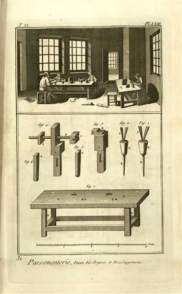 DIDEROT, D'ALEMBERT, Livorno 1779. Volume contenente 194 incisioni fuori testo, alcune a doppia pagina, inerenti la tessitura , la passamaneria e la seteria (difetti).