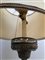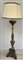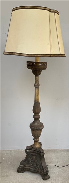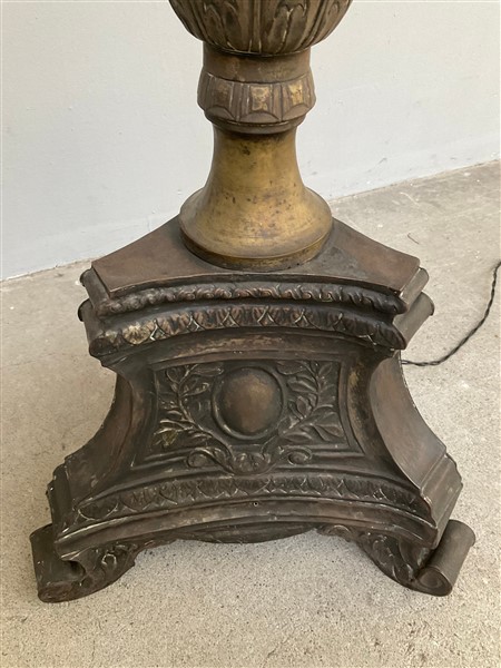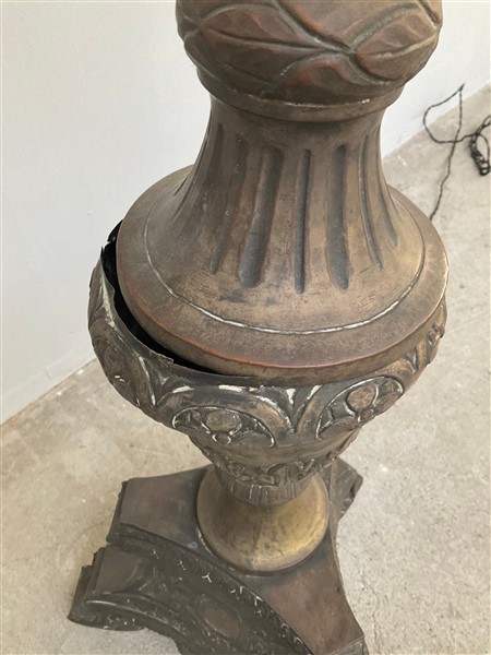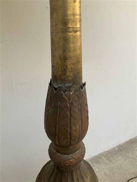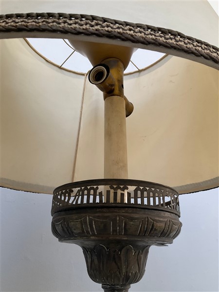 Grande torciera in metallo sbalzato con fusto a balaustro e base tripode, adattata a lampada in epoca posteriore, con paralume sagomato (h. tot. cm 191) (difetti)