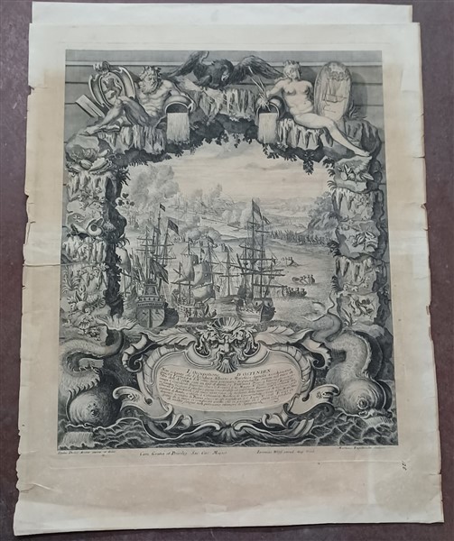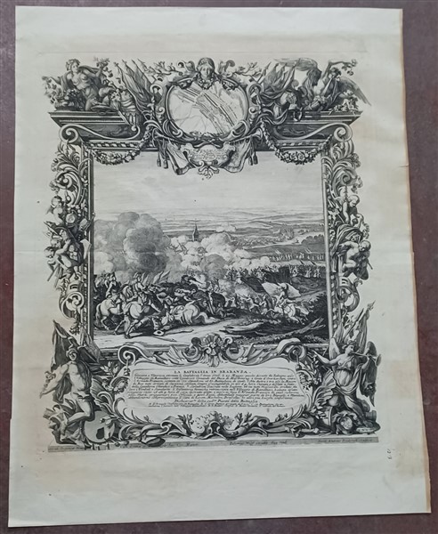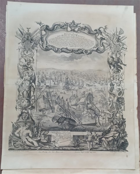 Lotto di tre tavole raffiguranti battaglie navali e terrestri: Battaglia navale presso Malaga, Occupazione di Ostenda,Battaglia a Brabanza. Augusta, Wolff sec. XVIII. Inc. in rame, ogni veduta è contornata da una fastosa cornice ornamentale a motivi naturalistici, architettonici, e allegorici, ogni tavola è corredata da un breve testo esplicativo inciso su altra matrice di rame e inserito nella bordura ornamentale. Dimensioni al foglio ca. mm. 560x450. Piega centrale editoriale, qualche rossura o menda nei margini ma, assai decorative. (3)