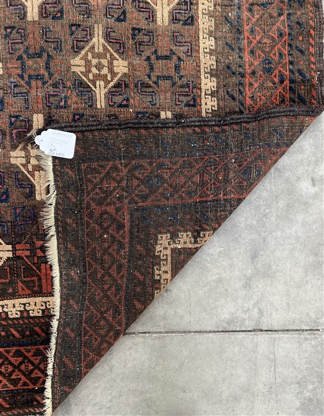 Tappeto Beluchistan, Persia, fine secolo XIX. Decoro a griglia su fondo marrone (cm 159x82) (difetti e rapature)