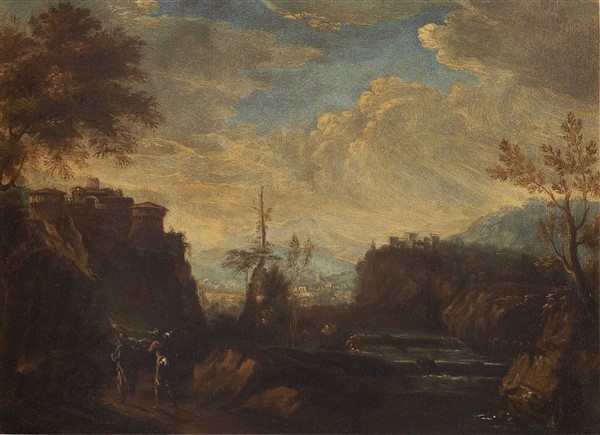 Scuola dell'Italia settentrionale del XVIII secolo Paesaggio con viandanti Oli