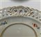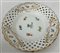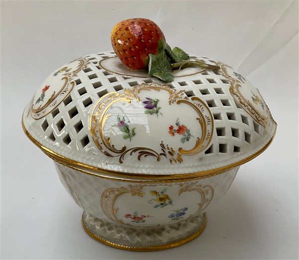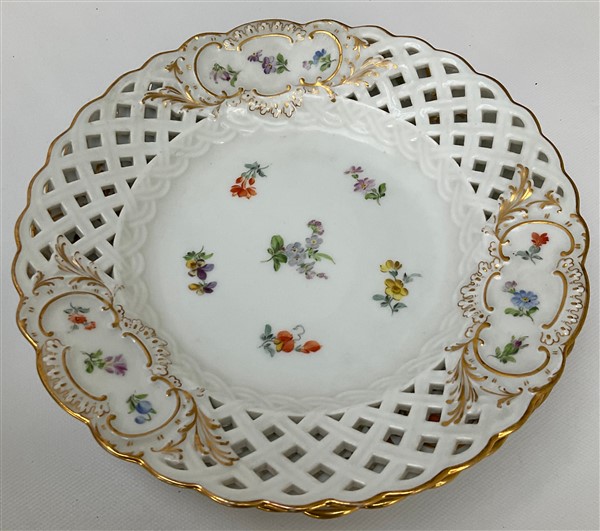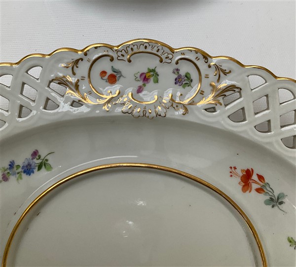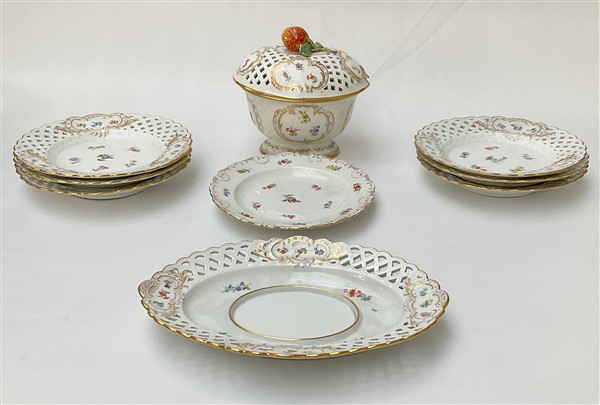 Manifattura di Meissen. Lotto composto da sei piatti in porcellana con bordo traforato, una piccola zuppiera con coperchio traforato e presa a fragola con vassoio ed un piattino, decoro in policromia con fiori sparsi e profili in oro (L. max cm 27) (lievi difetti)