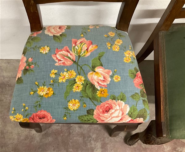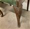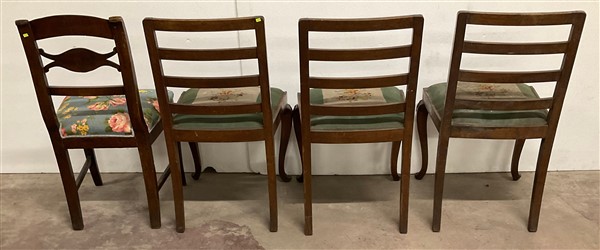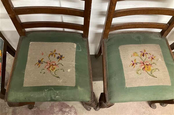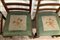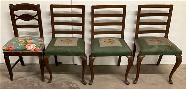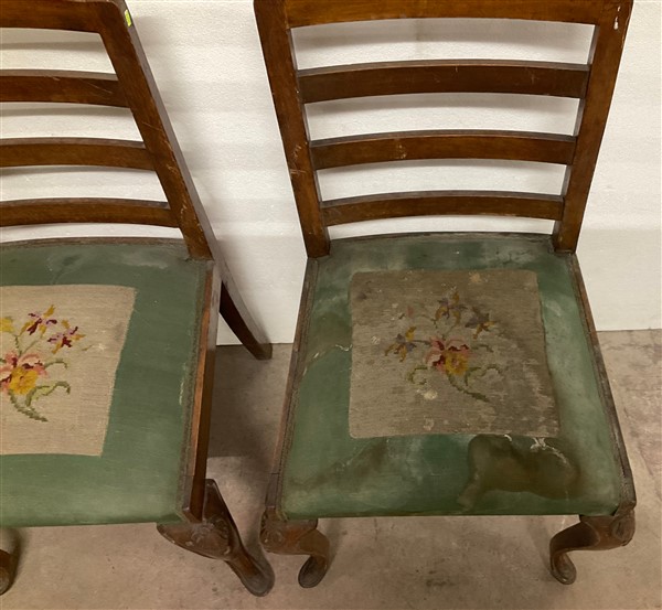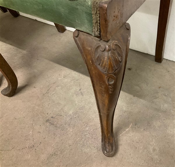 Gruppo di tre sedie in legno, schienali a giorno con listelli orizzontali, gambe anteriori intagliate e sagomate unite ad una diversa (difetti)