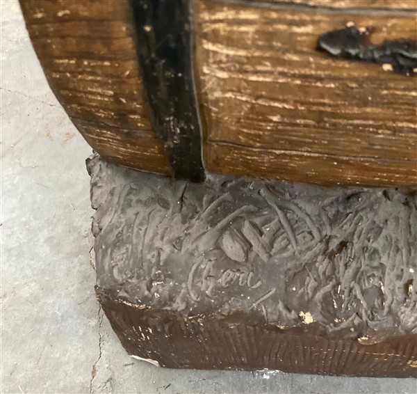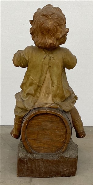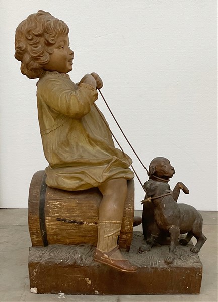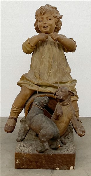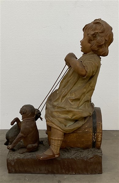 Scultore del secolo XX "Bambina seduta su botte con cagnolini" terracotta dipinta (h. cm 63) Traccia di iscrizione e numerali incussi (difetti e restauri)