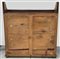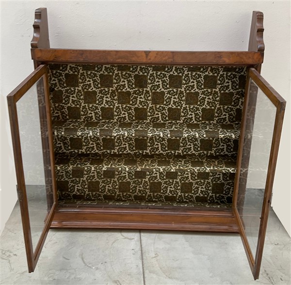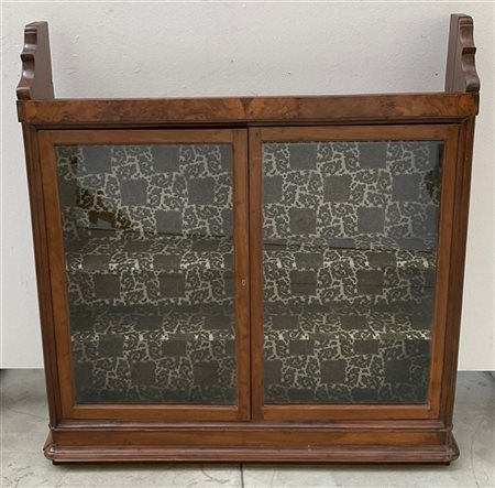 Parte di credenza a due ante a vetro in legni vari, interno a ripiani (cm 124x130x26) (difetti)