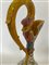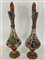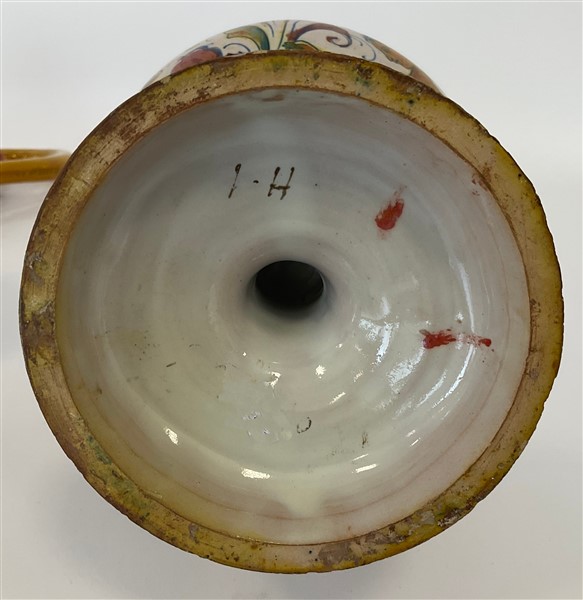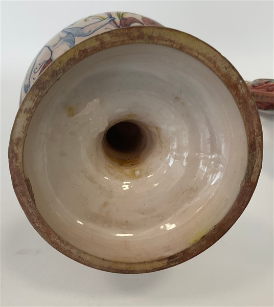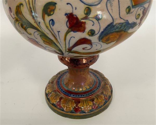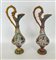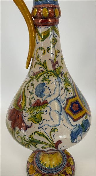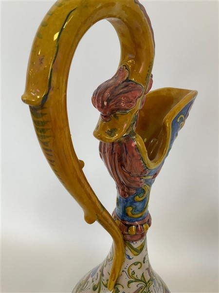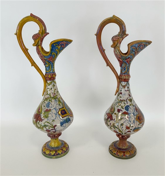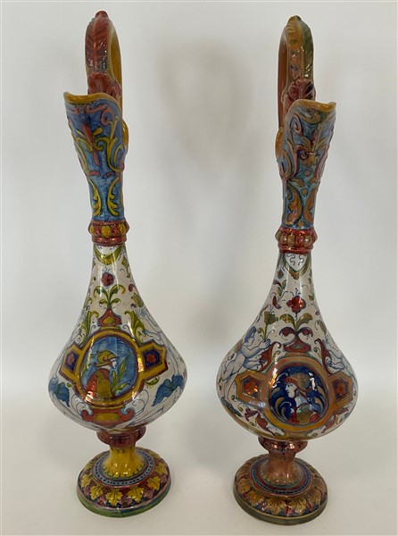 Manifattura dell'Italia centrale. Coppia di versatoi piriformi ad un'ansa in ceramica dipinta in policromia e decorata a lustri metallici con profili di guerrieri entro riserve e putti con ramage fiorite (h cm 58) (difetti)