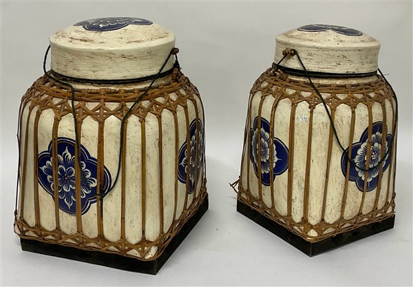 Due contenitori con coperchio in bambù dipinto ricoperti internamente ed esternamente in midollino