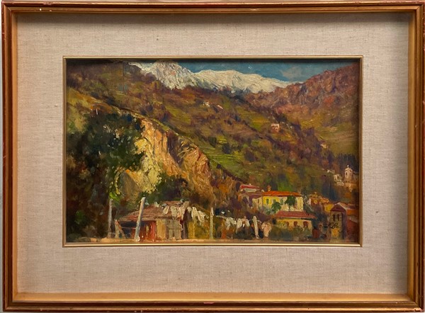 Ignoto del XX secolo "Scorcio montano" olio su compensato (cm 27,5x43,5) Reca