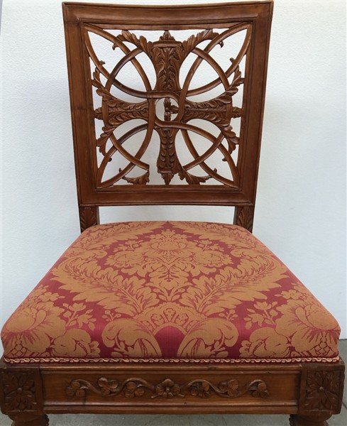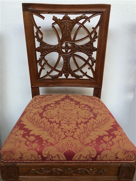 Gruppo di sei sedie in ciliegio, schienale riccamente traforato e intagliato a