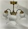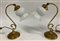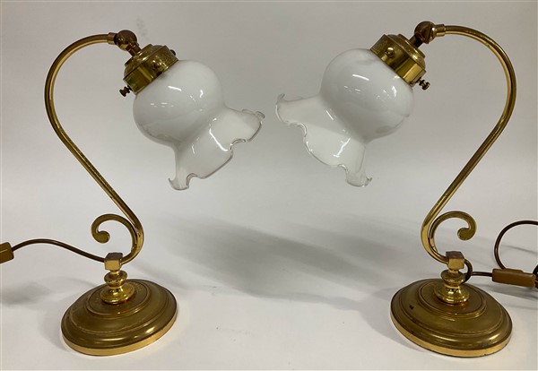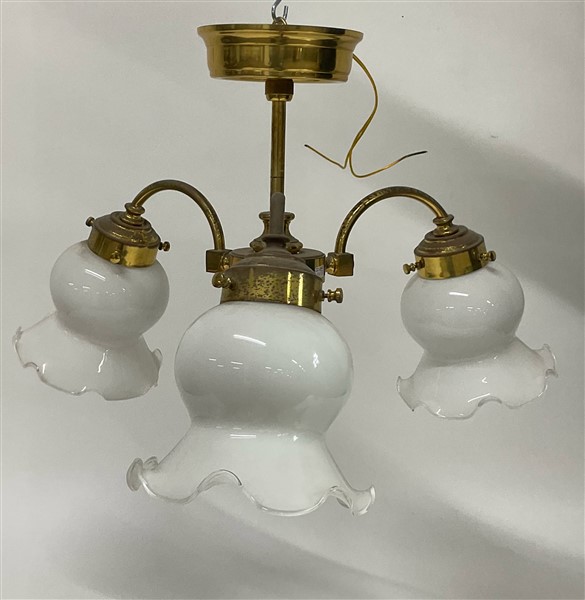 Lotto composto da due lampade da tavolo ed un piccolo lampadario a tre luci in ottone con paralumi in vetro lattimo a forma di fiore (difetti)