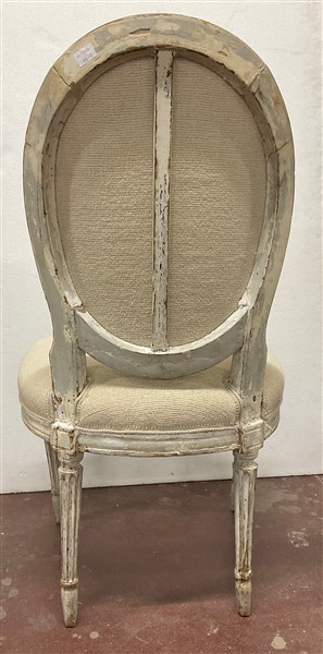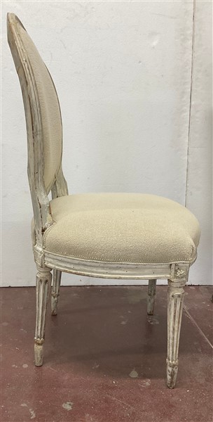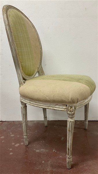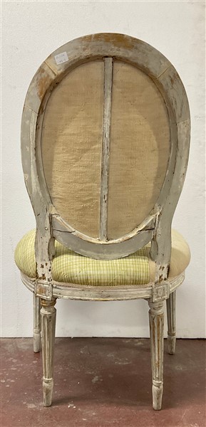 Lotto composto da coppia di antiche sedie in legno intagliato e dipinto con gambe rastremate e scanalate e una sedia con gambe dipinte in policromia terminanti a zoccolo (difetti e restauri)