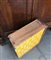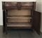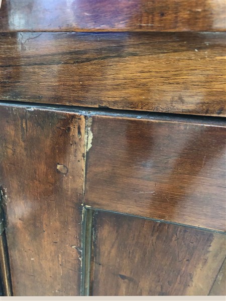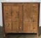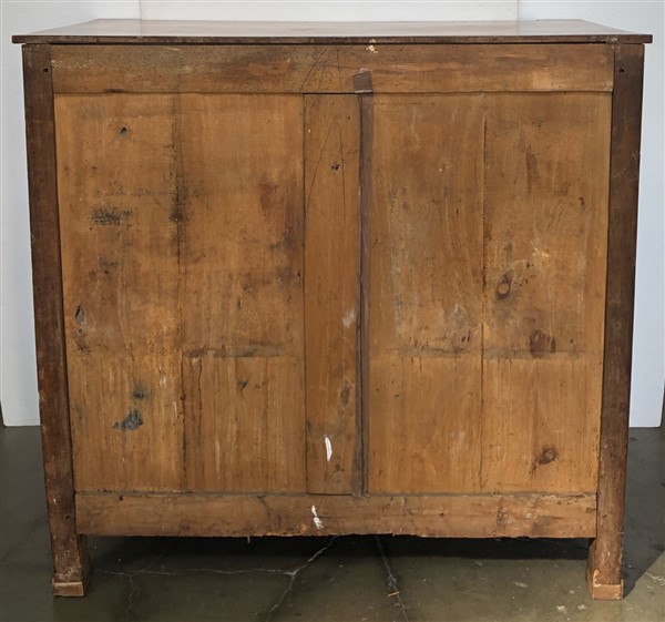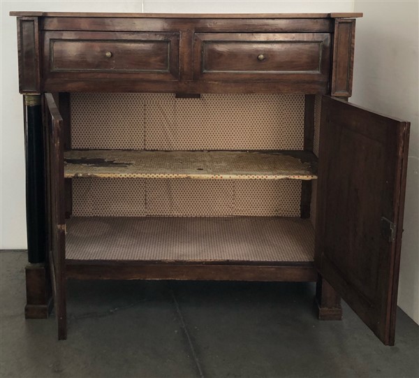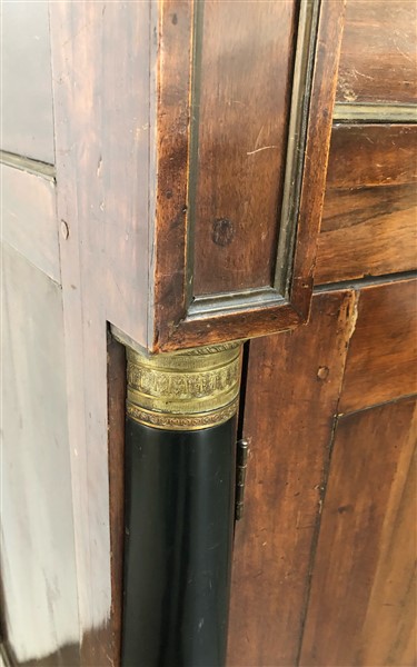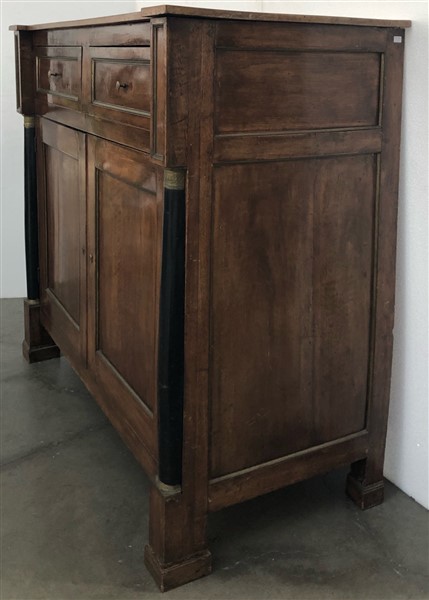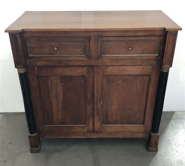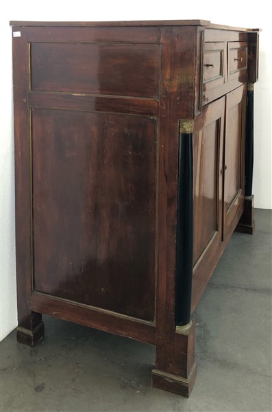 Credenza in mogano a due ante e due cassetti sul fronte, filettata in metallo. Montanti a mezze colonne in legno ebanizzato e piedi a plinto. Secolo XIX (cm 129x124x60) (restauri)