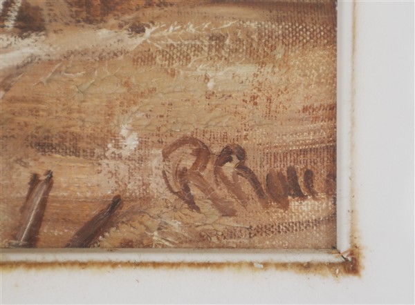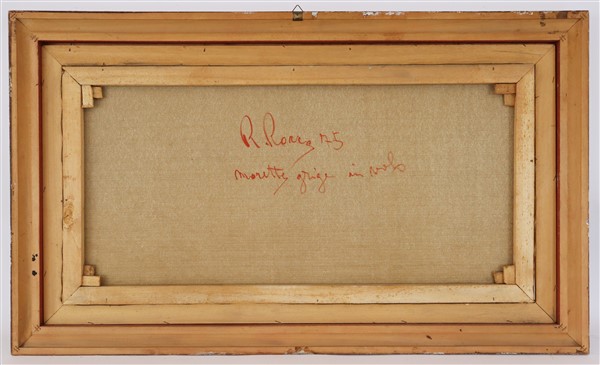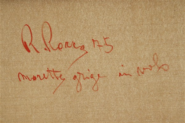 Firma indecifrata "Morette grigie in volo" 1975, olio su tela (cm 50x100) firmato in basso a destra; titolato, firmato e datato al verso