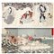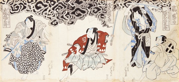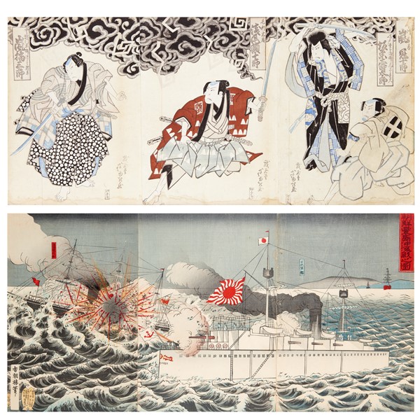 Lotto composto da due trittici, uno raffigurante la guerra cino-giapponese, l'altro una scena teatrale della scuola di Osaka, uno in cornice