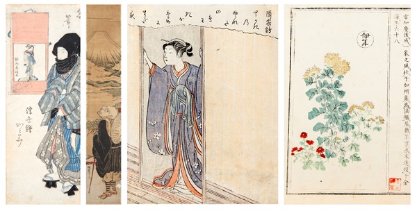 Lotto composto da una stampa a colonna di Koryusai e due pagine da due diversi libri illustrati uniti ad un'altra parte di stampa (difetti)