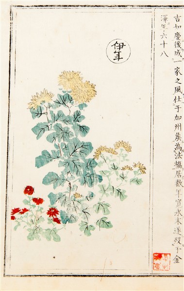 Lot of a print of Koryusai and two pages from two different illustrated books joined to another part of the print (defects)