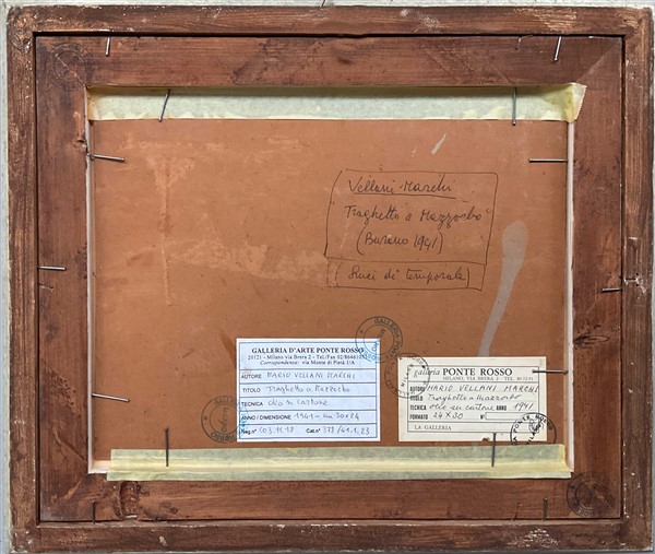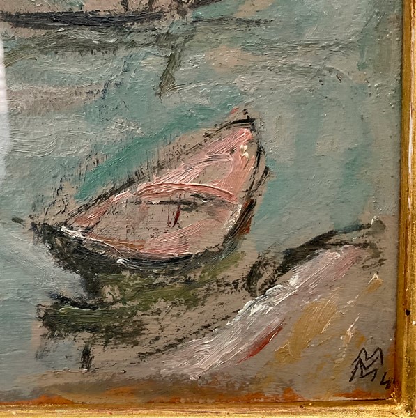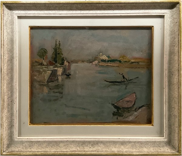 "Traghetto a Mazzorbo" 1941, olio su cartone (cm 24x30) Siglato e datato in basso a destra. Al retro: firmato, titolato, datato e locato Burano; cartigli e timbri. In cornice