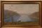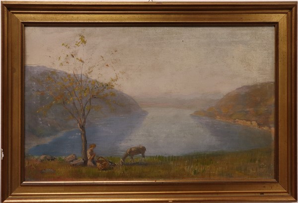 Firma indecifrata "Paesaggio lacustre con figura e pecora" olio su compesato (cm. 49x80) Tracce di firma e iscrizioni in basso a destra. In cornice