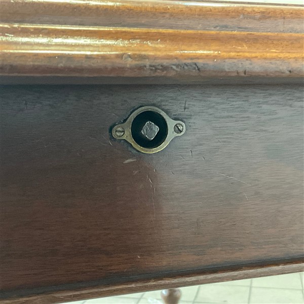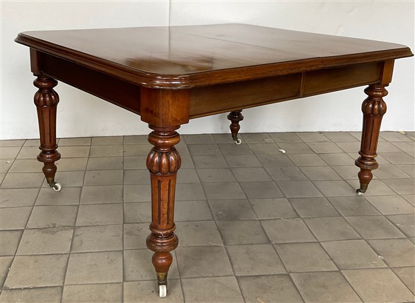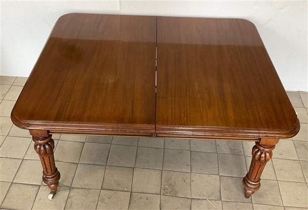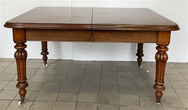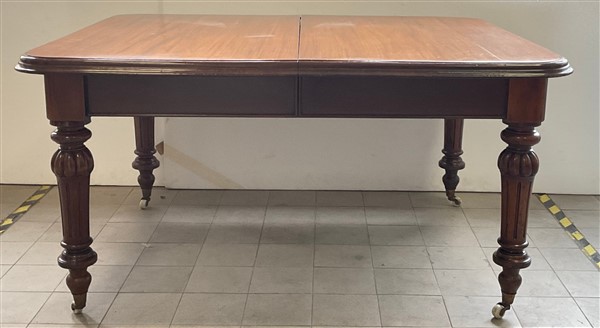 Tavolo allungabile a manovella in mogano, gambe a balaustro intagliato a baccellature e scanalate su rotelle. Inghilterra, secolo XIX (cm 143x77,5x120) (difetti e mancanze)
