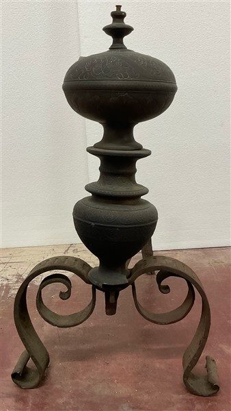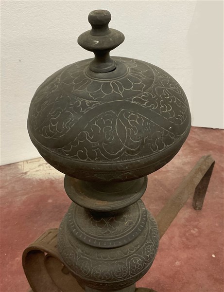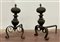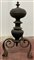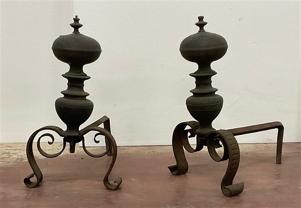 Coppia di alari da camino in bronzo decorati a rocchetto e incisi a fiori e vol