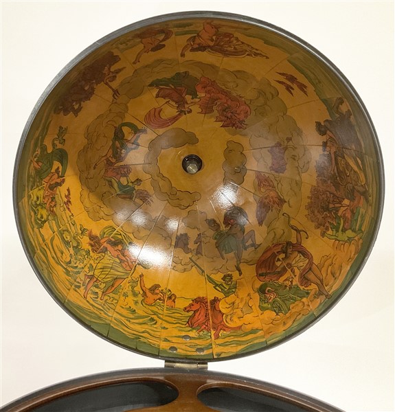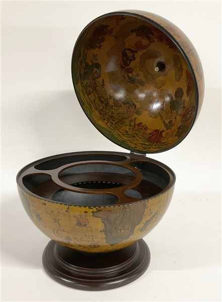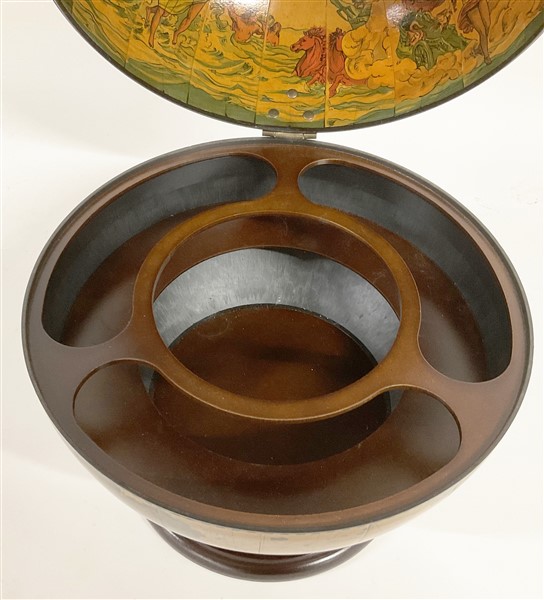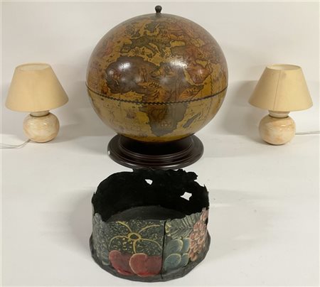 Lotto composto da un cestello in tollepaint, due abat jour in ceramica ed un mappamondo-bar in legno (d cm 45 ca)(difetti)