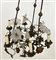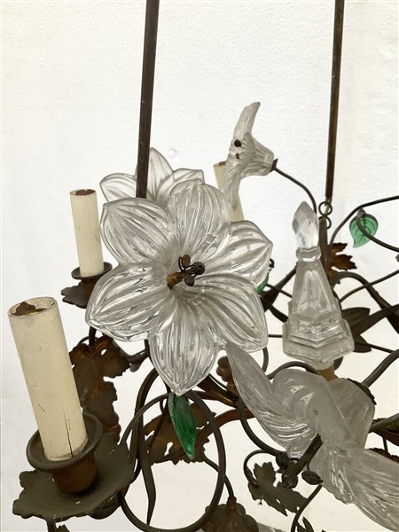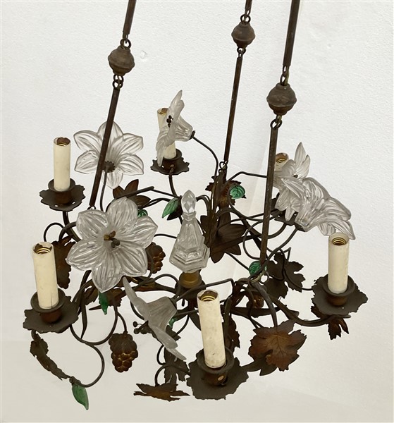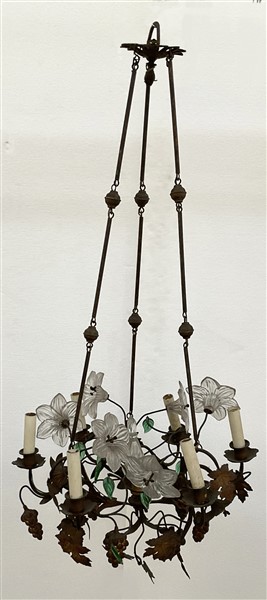 Lampadario a sei luci in ferro forgiato e vetro decorato a foglie e fiori (difetti)