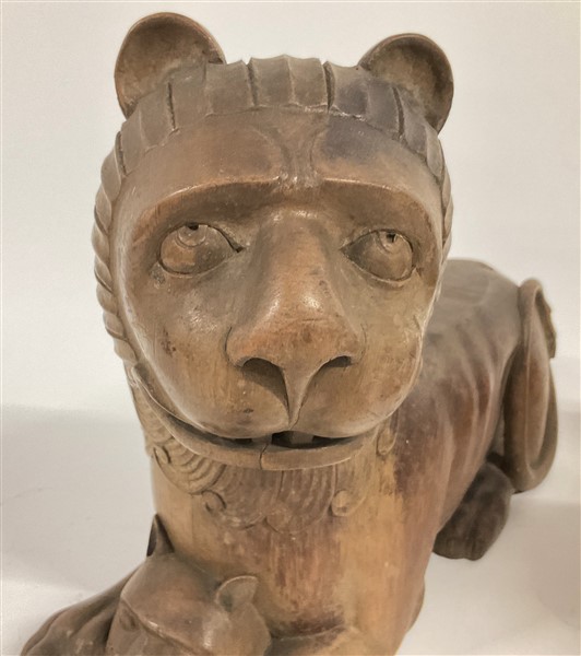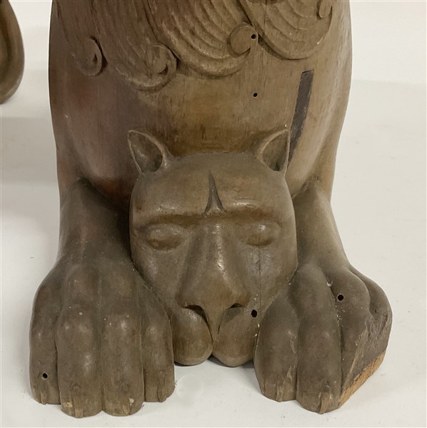 Coppia di sculture in legno raffiguranti leoni accovacciati