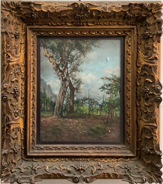 Ignoto del XX secolo, "Scorcio boschivo" olio su compensato (cm 30,5x23,5) In b