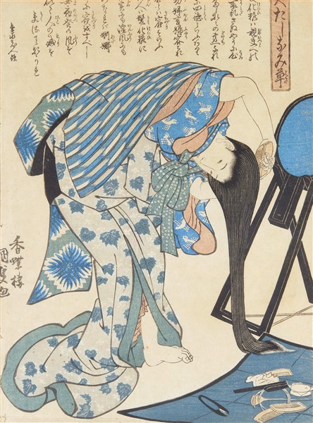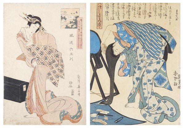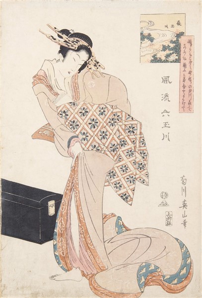 Lot of two woodcuts: Eizan "From the Series Fashionable Six Jewel Rivers" and Kunisada "woman in the mirror"