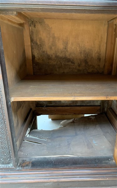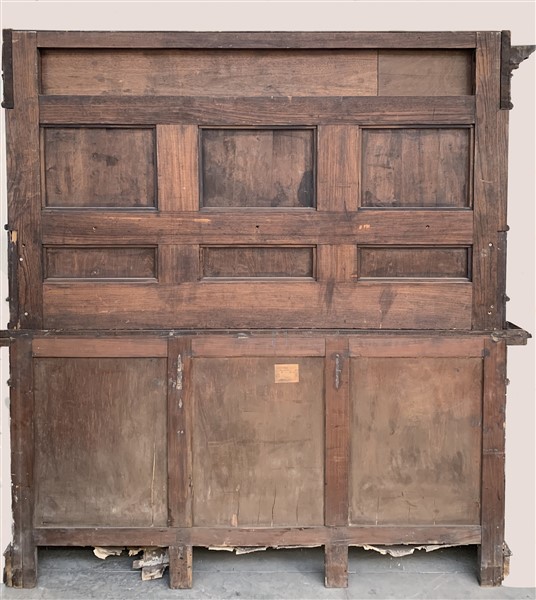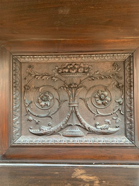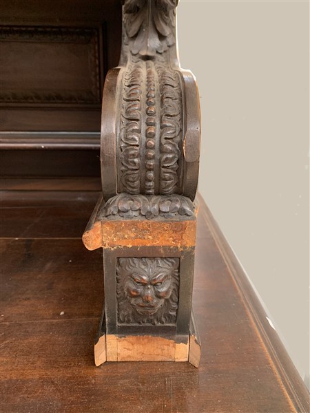 Prevosti-Varese. Credenza con alzata in noce interamente decorata da pannelli finemente intagliati a vasi fioriti, motivi vegetali, animali fantastici e fiori. Parte inferiore a tre ante e tre cassetti. Fine secolo XIX inizio XX (cm 208x215x66) Stampigliato nei cassetti .