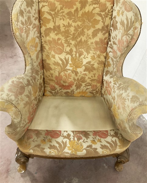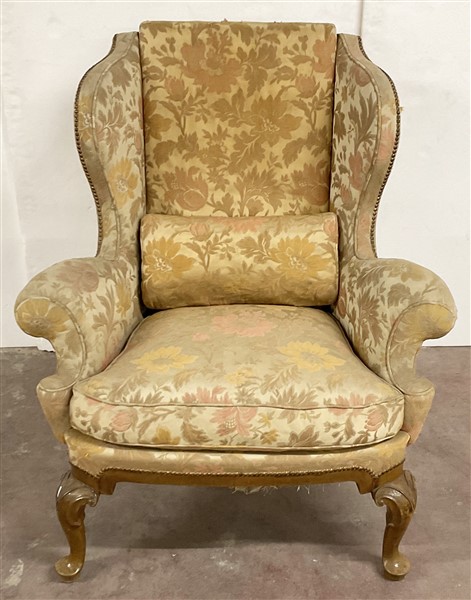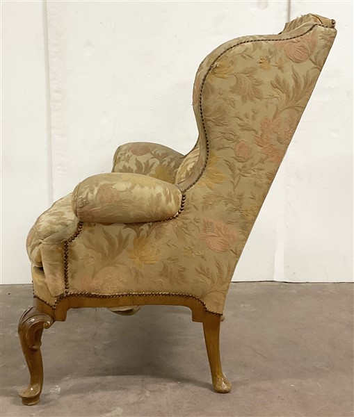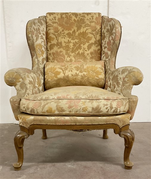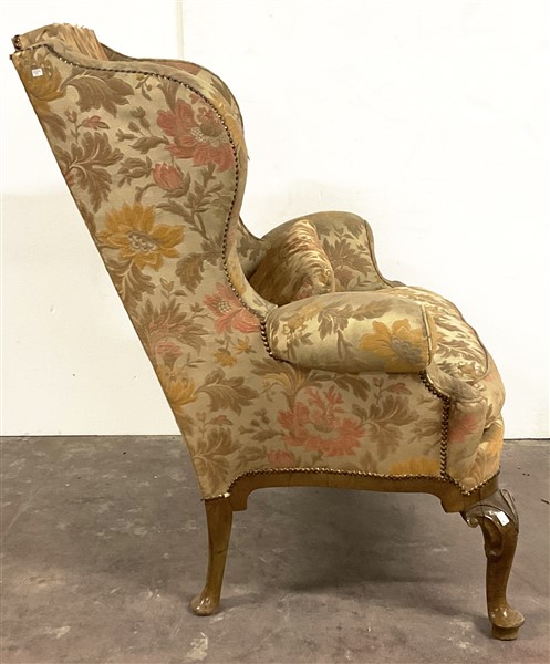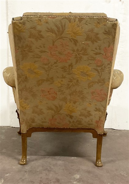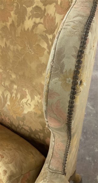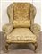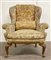 Poltrona bergère con braccioli sagomati. Gambe e fasce intagliate. Rivestita in tessuto a fiori (difetti)