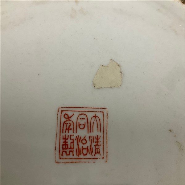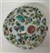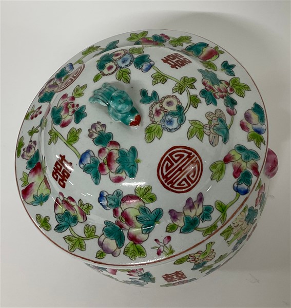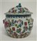 Vaso in porcellana con coperchio dipinto in policromia a decoro floreale e simboli cinesi, presa del coperchio a foggia di scoiattolo