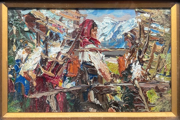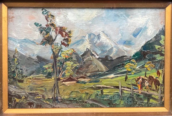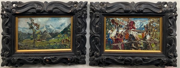 Ignoto del XX secolo, lotto di due dipinti ad olio su compensato raffiguranti "Contadine con gerle" e "Scorcio alpino" (cm 12,5x20)