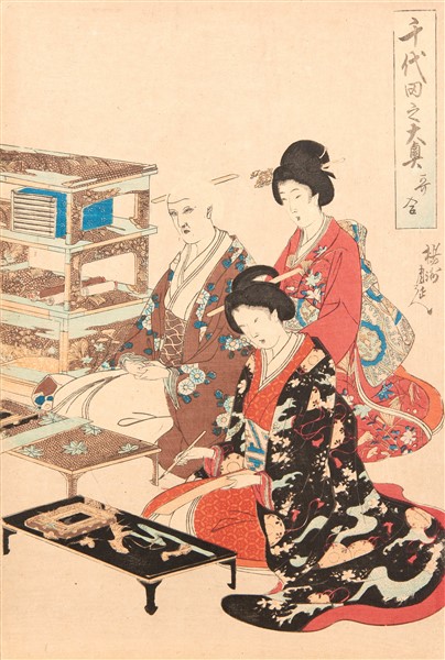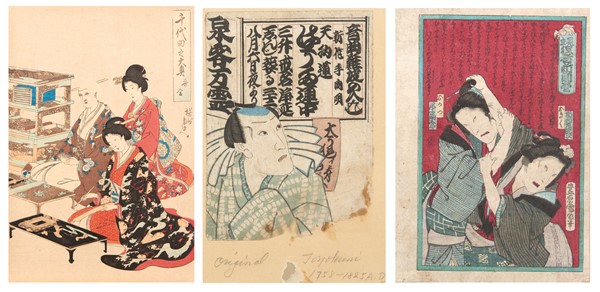 Lotto composto da un foglio di un trittico di Chikanobu e due pagine di due diversi libri illustrati, una attribuita a Toyokuni I, l'altra firmata di Kunichika
