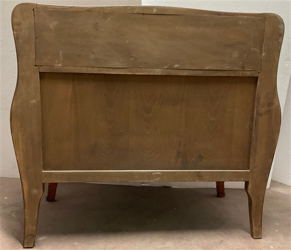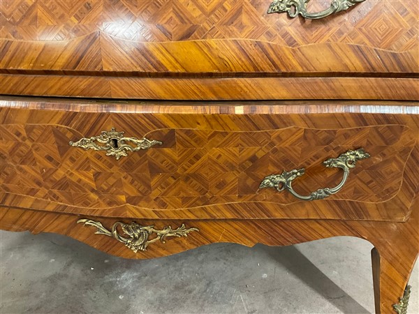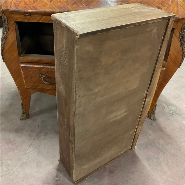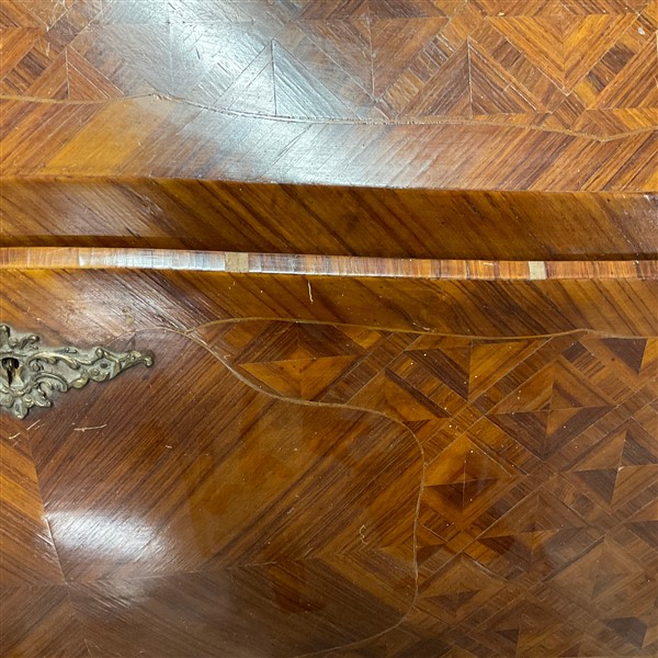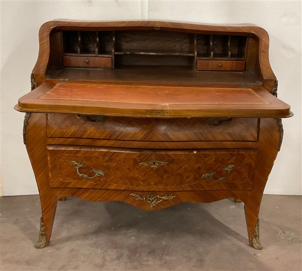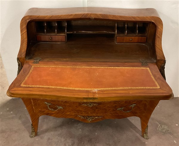 Ribalta di forma mossa e bombata lastronata e intarsiata, calatoia con cassetti