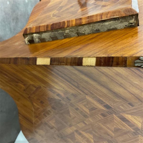 Ribalta di forma mossa e bombata lastronata e intarsiata, calatoia con cassettini e vani (cm 106x98x53) (difetti e mancanze)