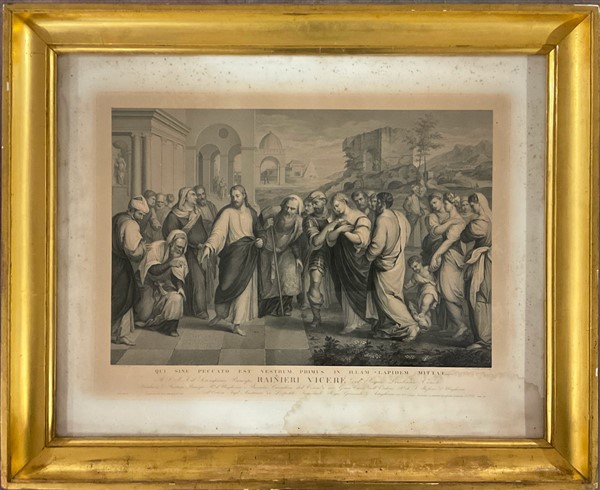 Pietro Anderloni "Chi è senza peccato scagli la prima pietra" incisione da Tiziano Vecellio (cm 65x82) in cornice del secolo XIX (difetti)