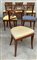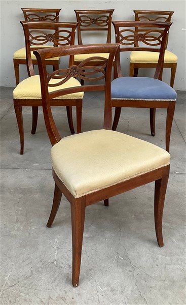 Gruppo di sei sedie in legno intagliato con schienale a giorno e gambe a sciabola. Veneto, inizio secolo XIX (difetti e mancanze)