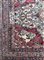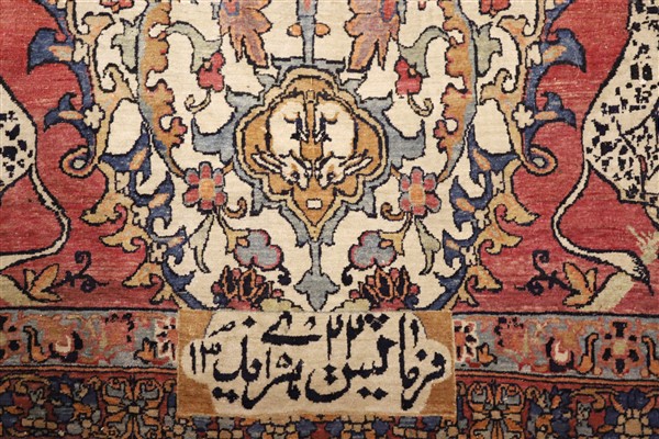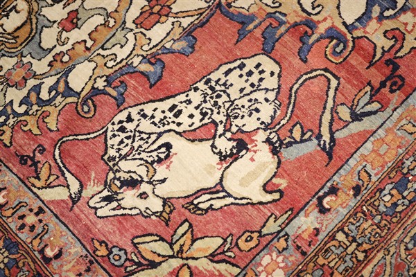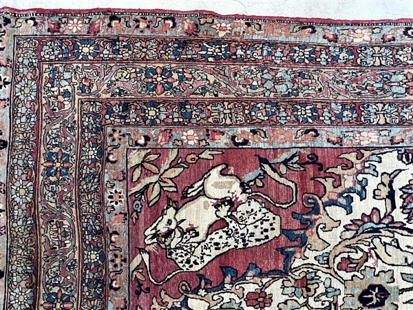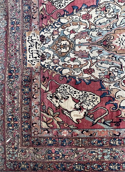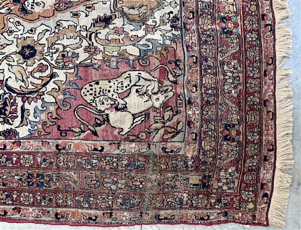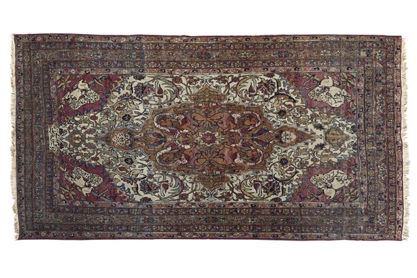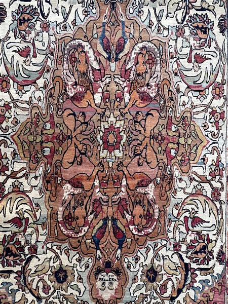 Tappeto Kirman, Persia, inizio secolo XX. Decoro con grande medaglione ornato da quattro combattimenti tra fiere, un drago ed un leone, su fondo nocciola. Il medaglione poggia su un campo color bianco decorato da rami fioriti e volatili con due puntali componenti una coppia di lapin. Angolari a fondo color ciclamino raffiguranti lotta tra leopardo ed ungulato. Ad una testata cartiglio con iscrizione in persiano antico e datazione (cm 375x198) (difetti)