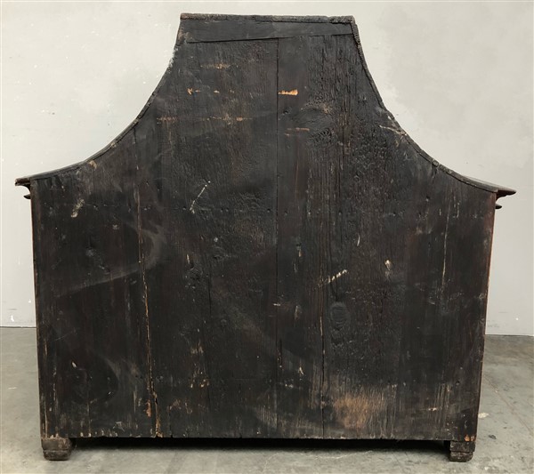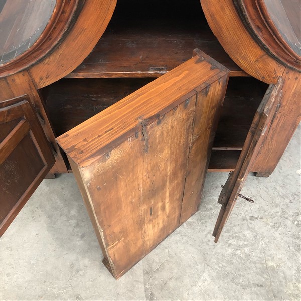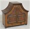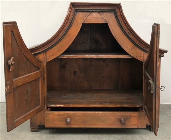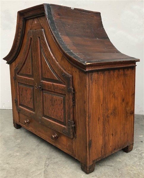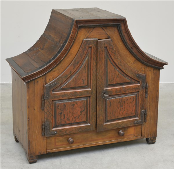Stipo a due sportelli pannelati e decorati, un cassetto e cerniere a vista in ferro battuto. Secolo XIX (cm 88x87x44) (difetti e restauri)