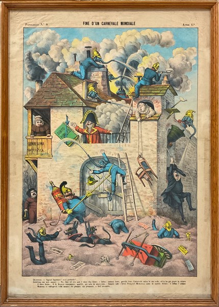 Pagina illustrata del periodico satirico "Pappagallo" n°8 dell'anno 1°. "Fine d'un carnevale mondiale" 1850 ca - (cm 58x41) in cornice (difetti)