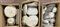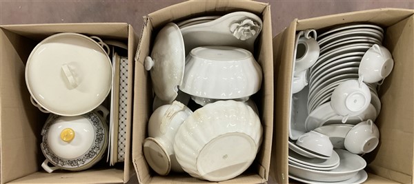 Manifatture diverse tra cui Laveno e Ginori. Lotto di tre cartoni contennti parti di servizi e oggetti da tavola in ceramica e porcellana (difetti)