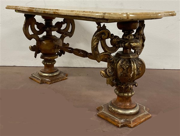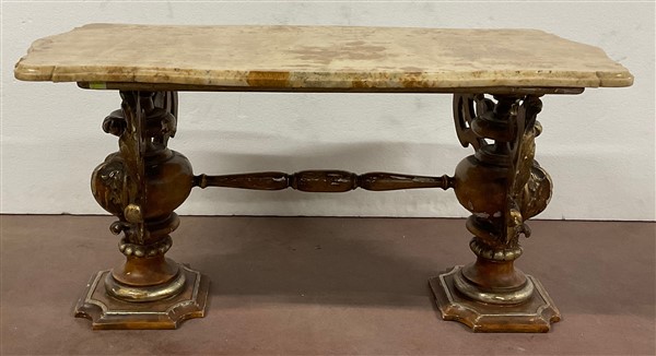 Tavolo da salotto in legno intagliato, laccato e dorato. Montanti a finti vasi biansati riuniti da traversa a rocchetto. Piano sagomato in marmo (cm 85x45x44,5) (difetti)