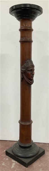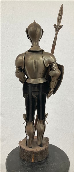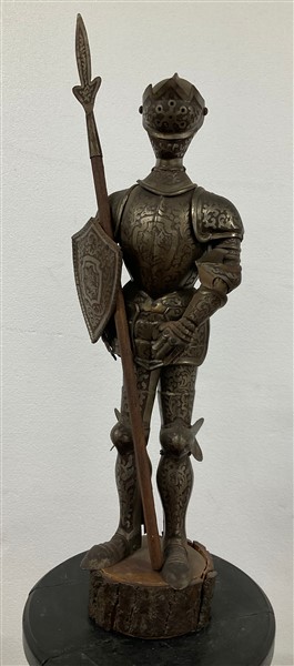 Manifattura spagnola, secolo XX. Modello in miniatura di armatura cavalleresca in ferro, portante armatura mobile completa di scudo e alabarda. Inciso all'acido a motivi fitili (h. cm 55) Piano e base ebanizzati (h. cm 110) (difetti)