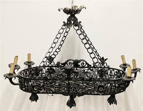 Grande lampadario in fero battuto e verniciato nero a quattordici luci riccamente decorato a volute e motivi vegetali (cm 150x54x65) (difetti)