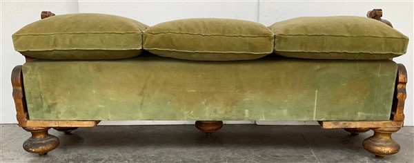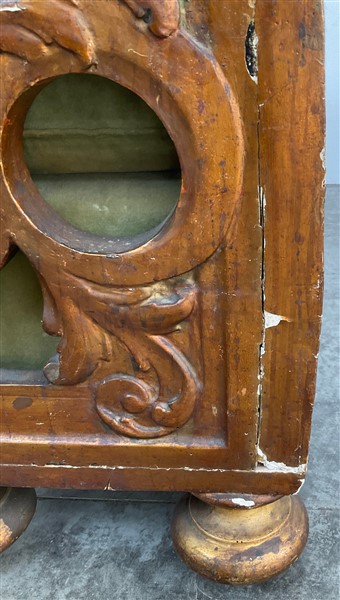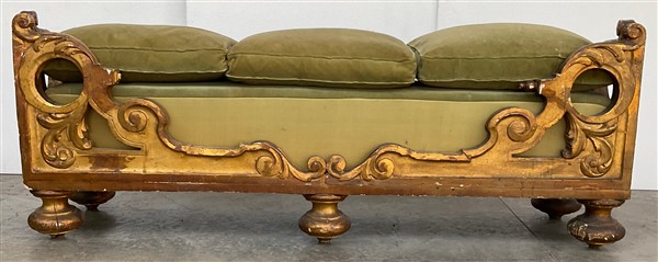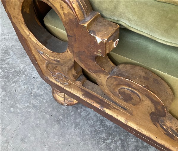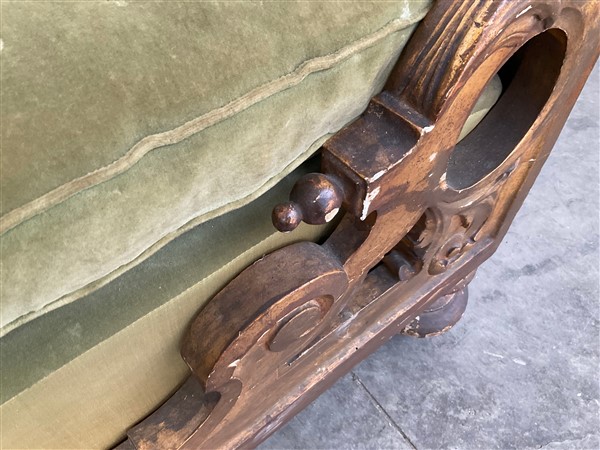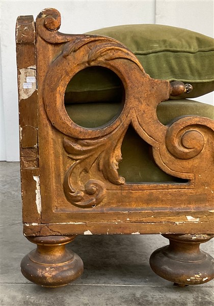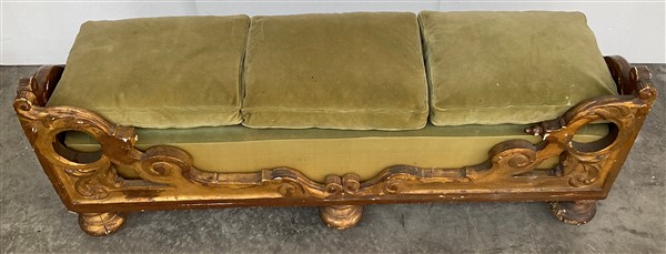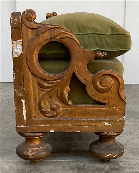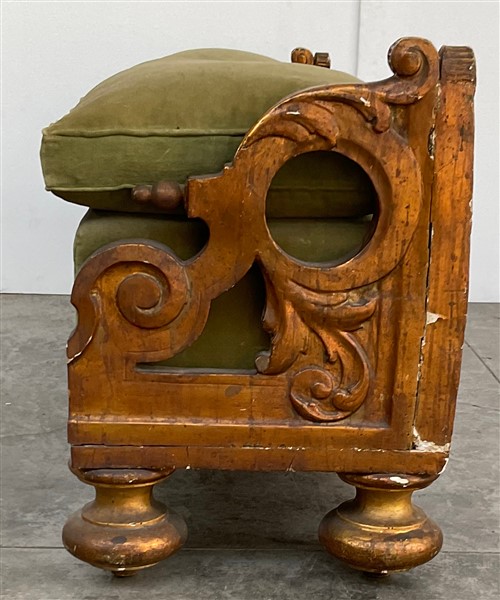Panchetta da muro in legno intagliato e dorato a volute. Seduta imbottita e rivestita in velluto verde, piedi a cipolla. Fine secolo XIX (cm 150x57x42) (rotture, mancanze e adattamenti)