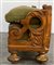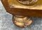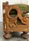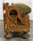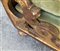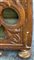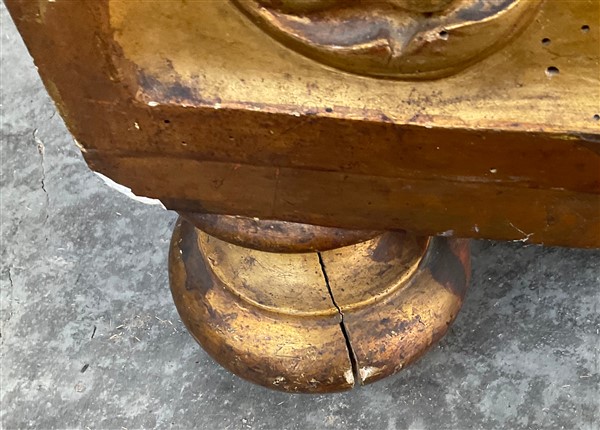 Panchetta da muro in legno intagliato e dorato a volute. Seduta imbottita e riv